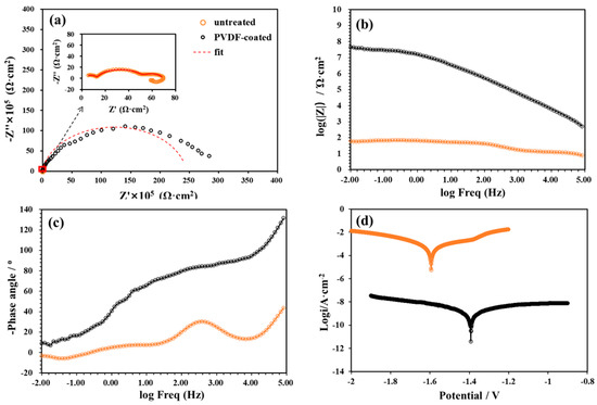 The corresponding impedance modulus and phase angle plots are presented in Figure 8b,c. Typically, the impedance modulus at the lowest frequency (|Z|0.01 Hz) serves as a semi-quantitative indicator of the coating’s anticorrosion performance [54]. As depicted in Figure 8b, the |Z|0.01 Hz value of the PVDF-coated sample was higher than that of the untreated sample, demonstrating the coating’s excellent protective ability for the substrate. Additionally, the Bode-phase angle plot was analyzed to assess the coating’s protection performance. Higher phase angle values in the high-frequency range are typically associated with superior corrosion protection properties in specimens [55]. As shown in Figure 8c, the PVDF coating had a higher phase angle in the high-frequency domain. Collectively, these results confirm that the fabricated PVDF coating offers superior anticorrosive properties.