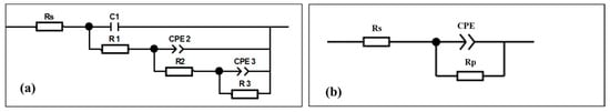 Equivalent circuits used for modelling EIS spectra. (a) untreated Mg alloy and (b) as-prepared PVDF-coated Mg alloy.