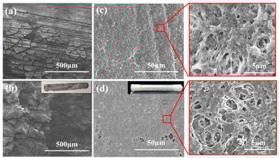 The untreated substrate exhibited significant degradation after just 1 day of exposure to the SBF solution, with numerous cracks appearing on its surface. As the immersion time extended to 14 days, uneven corrosion pits and defects were formed (Figure 11b). Therefore, the geometric shape of the substrate was altered, as indicated by the inset of Figure 11b. In contrast to the untreated samples, the PVDF-coated samples maintained a surface morphology similar to their original state. Even after 14 days of immersion, only slight corrosion was found, as shown in Figure 11d. There were no cracks, but there were large holes; so, the geometric shape remained unchanged (inset of Figure 11d). The coating retained a porous structure, with some deposition products dispersed within the holes, as depicted in the zoom-in views of Figure 11c,d.