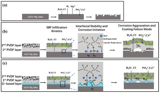 A schematic illustration of the corrosion steps. (a) bare Mg alloy; (b) PVDF coating on Mg alloy; (c) PVDF coating on Zr-treated Mg alloy.