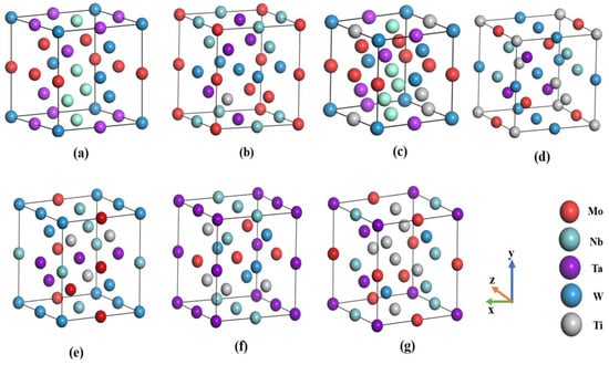 Cell model of TixNbMoTaW high-entropy alloy: (a) NbMoTaW, (b) Ti0.25NbMoTaW, (c) Ti0.5NbMoTaW, (d) Ti0.75NbMoTaW, (e) TiNbMoTaW, (f) Ti1.5NbMoTaW, (g) Ti2NbMoTaW.