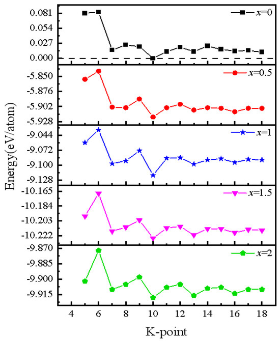 In this study, the Special Quasirandom Structures (SQS) method is used for modeling. Figure 1 shows the unit cell model of the body-centered cubic (BCC) structure for the TixNbMoTaW refractory high-entropy alloy. In this study, first-principles calculations based on density functional theory (DFT) were performed using the Cambridge Sequential Total Energy Package (CASTEP) [27]. Traditional nanoindentation allows for the rapid and practical assessment of material mechanical properties [28,29,30], while first-principles calculations provide high precision and a deep understanding of material characteristics. During the calculations, the electron exchange-correlation function was modeled using the Perdew–Burke–Ernzerhof (PBE) [31] functional under the Generalized Gradient Approximation (GGA-PBE) [32], the interaction potential between valence electrons and ions was simulated using the ultrasoft pseudopotential (USPP), and the plane-wave function expansion cutoff energy was set to 650 eV. Geometry optimization of the structure was carried out using the Broyden–Fletcher–Goldfarb (BFG) algorithm. For the Self-Consistent Field (SCF) calculations, electron relaxation was performed using the Pulay density mixing method. The convergence criteria for the SCF calculations were as follows: the total energy was converged to within 1.0 × eV/atom, the force on each atom was less than 0.05 eV/Å, the displacement tolerance was below 0.002 Å, and the maximum stress deviation was smaller than 0.1 GPa. To ensure the accuracy of the computational results, the optimal K-point grid was selected based on the lowest energy criterion. As shown in Figure 2, the energy is lowest and the convergence is best when the K-point grid is set to 10 × 10 × 10 for all five alloys. Therefore, in this study, a K-point grid of 10 × 10 × 10 was used for the calculations.