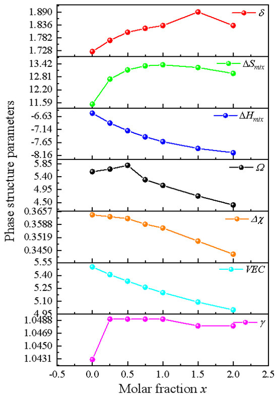 This study uses computational analysis to determine the specific phase types of a high-entropy alloy based on parameters such as atomic radius difference (δ), mixing enthalpy (ΔHmix), mixing entropy (ΔSmix), entropy-to-enthalpy ratio (Ω), electronegativity difference (Δχ), atomic size difference parameter (γ), and average valence electron concentration (VEC) [33,34]. The atomic radius difference (δ) reflects the disparity in atomic radii among the constituent elements. The entropy-to-enthalpy ratio (Ω) indicates the relative weight of entropy and enthalpy in the alloy, helping to assess the alloy’s entropy level and preventing the formation of intermetallic compounds. When the alloy parameters meet the following conditions, the alloy exhibits a disordered solid solution phase: δ < 6.5%, −15 ≤ ΔHmix ≤ 5 kJ/mol, 12 ≤ ΔSmix ≤ 17.5 J/(K·mol), and Ω ≥ 1.1 [29,30,31,32]. An atomic size difference parameter (γ) < 1.175 and a small electronegativity difference indicate a tendency for the alloy to form a solid solution. When the average valence electron concentration (VEC) is ≤ 6.87, the alloy crystallizes in a body-centered cubic (BCC) structure; for 6.87 ≤ VEC ≤ 8, the alloy adopts a dual-phase BCC and face-centered cubic (FCC) structure, and when VEC ≥ 8, the alloy forms an FCC structure [35].