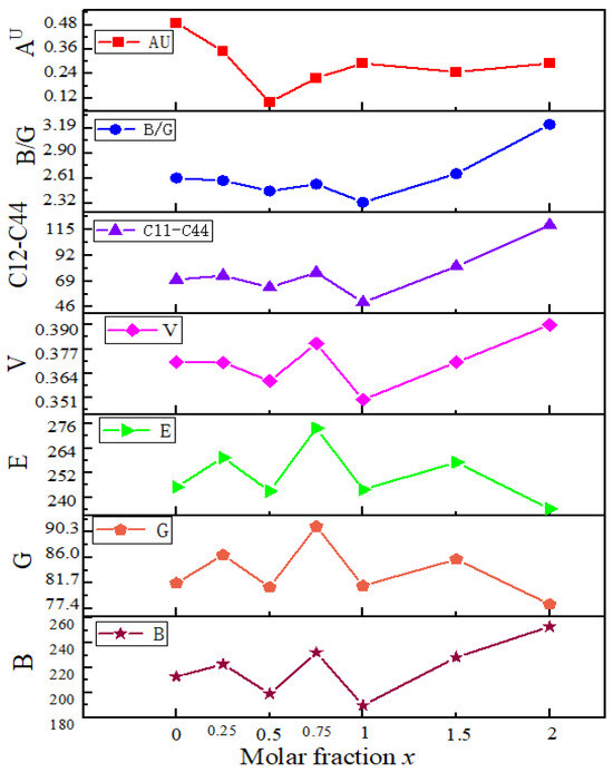 As shown in Table 2, the elastic constants of the high-entropy alloy in this study satisfy the mechanical stability criteria, indicating that the alloy is mechanically stable under 0 GPa conditions. To predict the elastic properties of TixNbMoTaW refractory high-entropy alloys (RHEAs) with compositions of x = 0, 0.25, 0.5, 0.75, 1, 1.5, 2, the Voigt–Reuss–Hill (VRH) approximation method was employed to calculate parameters such as the bulk modulus (B), Young’s modulus (E), Poisson’s ratio (ν), and shear modulus (G) [39,40]. Additionally, the Pugh ratio (B/G), Cauchy pressure (C11–C44), hardness (H), and universal anisotropy index () [41] were computed using the formulas provided. The results are presented in Table 2.