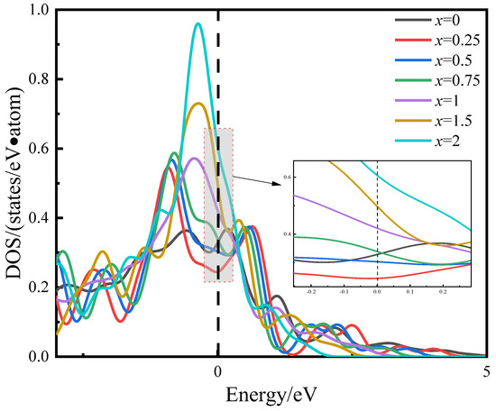 Figure 6 illustrates the density of states (DOS) for TixNbMoTaW alloys. The DOS curve remains continuous at the Fermi level (0 eV), with a high density of states, indicating a significant presence of free electrons at the Fermi level, thus exhibiting a distinct metallic characteristic for this alloy system. The lower the electron density at the Fermi level, the more stable the structure is considered to be [45], whereas a higher density of states at this level suggests bonding instability in the system [46]. As shown in Figure 6, the peak DOS below the Fermi level in TixNbMoTaW RHEAs shifts towards higher energy levels as the Ti content in the system increases. In Figure 6, the DOS at the Fermi level first decreases and then continuously increases with increasing Ti content. Therefore, the addition of Ti reduces the structural stability of TixNbMoTaW RHEAs.