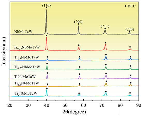 To verify the conclusion of a body-centered cubic (BCC) solid solution structure, this section analyzes the microstructure of the alloy through experimental characterization. X-ray diffraction (XRD) was employed to study the TixNbMoTaW refractory high-entropy alloys (HEAs). Figure 7 presents the XRD patterns of the as-cast TixNbMoTaW HEAs. It can be observed that all seven HEAs exhibit a single BCC phase structure, confirming that the experimental results are consistent with the predictions made in the above based on phase formation criteria.