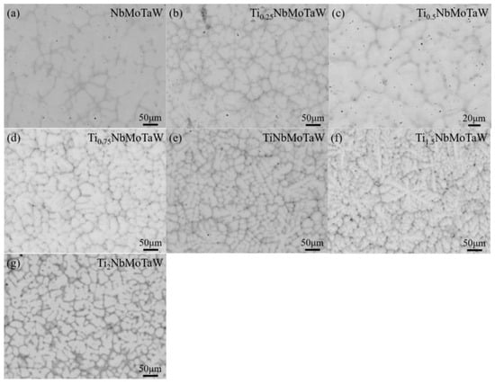 Backscattered electron image of as-cast TixNbMoTaW high-entropy alloys: (a) NbMoTaW, (b) Ti0.25NbMoTaW, (c) Ti0.5NbMoTaW, (d) Ti0.75NbMoTaW, (e) TiNbMoTaW, (f) Ti1.5NbMoTaW, (g) Ti2NbMoTaW.