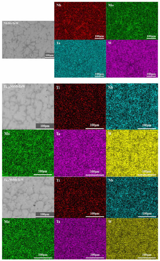 Based on the relationship between contrast in backscattered images and atomic number, elements with a higher atomic number generate stronger backscattered electron signals, resulting in a brighter image, while elements with a lower atomic number appear darker. The TixNbMoTaW high-entropy alloys are single-phase BCC solid solutions with no secondary phases present. It can be inferred that different degrees of elemental segregation exist in the seven alloys, with the lower-atomic-number elements, such as Ti, Nb, and Mo, likely concentrating in the darker dendritic regions, while the higher-atomic-number elements, like W and Ta, are likely enriched in the brighter inter-dendritic areas.