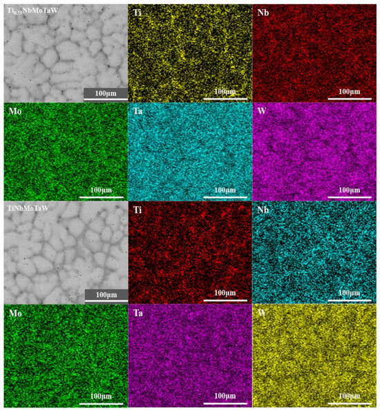 Figure 9 shows the scanning backscattered electron (BSE) images and energy-dispersive spectroscopy (EDS) maps of the seven TixNbMoTaW high-entropy alloys. It can be observed that when the Ti molar fraction in the alloy is greater than or equal to 0.75, the contrast in the EDS maps becomes more distinct. Taking the Ti0.75NbMoTaW high-entropy alloy as an example, it is clearly seen that Ti, Nb, and Mo are enriched in the dendritic regions, which appear brighter with more pronounced contrast. In contrast, the interdendritic regions are enriched with Ta and W, and these areas appear darker with lower contrast. By comparing the melting points and atomic masses of the elements in the alloy, it is found that during non-equilibrium solidification, heavy elements with higher melting points and atomic masses, such as W and Ta, tend to accumulate in the interdendritic regions, while lighter elements with lower melting points and smaller atomic masses, such as Ti, Nb, and Mo, are more likely to concentrate in the dendritic regions.