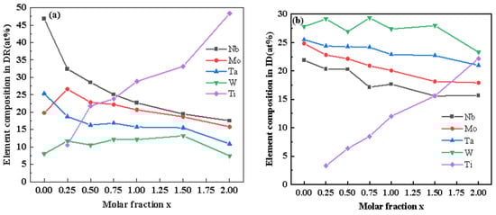 Figure 10 shows the compositional distribution of elements in the dendritic (DR) and interdendritic (ID) regions of the TixNbMoTaW high-entropy alloys. It can be observed that in the dendritic (DR) region, the composition curves of Nb and Mo are higher than those of W and Ta, while in the interdendritic (ID) region, the composition curves of Ta and W consistently lie above those of Nb and Mo. Additionally, the composition curve of Ti reveals that in the dendritic (DR) region, the Ti content increases significantly, reaching approximately 50 at% when x = 2, while in the interdendritic (ID) region, the maximum Ti content does not exceed 25 at%. Therefore, Figure 10 visually represents the elemental segregation trends observed in TixNbMoTaW refractory high-entropy alloys.