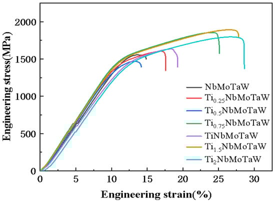 Engineering stress–strain curves for room-temperature compression of refractory high-entropy alloys of the TixNbMoTaW system in cast temper.