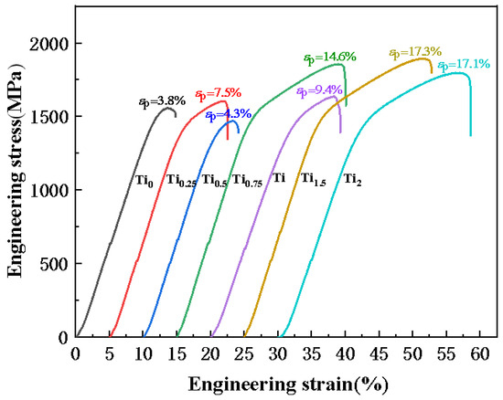 Figure 11 presents the engineering stress–strain curves of the TixNbMoTaW refractory high-entropy alloys (HEAs) under quasi-static compression at room temperature (25 °C). The strain rate for the uniaxial compression test is set to 5 ×, and Figure 12 illustrates the compressive plastic strain for each of the seven refractory HEAs. Table 4 summarizes the experimentally measured values for the yield strength, fracture strength, and plastic strain of the TixNbMoTaW HEAs at room temperature.