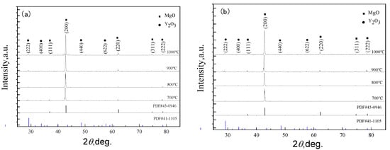 Figure 1a,b show XRD patterns of precursors prepared for single-phase and composite precipitants after calcination at different temperatures for 1.5 h. From Figure 1a,b, it can be seen from the comparison that when the calcination temperature is 700 °C, no obvious diffraction peaks appear, and amorphous materials are the main ones; when the calcination temperature is 800 °C, the intensity of some characteristic peaks of Y2O3-coated MgO: Ce+3 is weak. At 900 °C, a complete Y2O3-coated MgO: Ce+3 crystal phase is formed, and compared with the characteristic peaks of MgO standard PDF # 450946 and Y2O3 standard PDF # 411105, two corresponding identical crystal phases appear. As the calcination temperature increases, the main characteristic peaks of crystal formation gradually increase and the half width narrows, indicating that the precursor crystallization tends to be complete, and the degree of crystallization transformation of the sample at high temperatures is improved [,]. The XRD characteristic peaks of two coated samples with different precipitants are basically the same, indicating that the two precipitants have no significant effect on the phase structure.