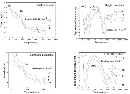 DTA-TG curves of precursors of single-phase (a,b) and composite (c,d) precipitants at different heating rates.