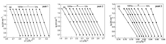 The formula using Kissinger’s method shows a linear relationship between ln (β/Tm2) and 1/Tm. Plot ln (β/Tm2) against 1/Tm and calculate the activation energy of the reaction by the slope (−E/R) (see Figure 6a,b). The slope of each straight line in the figure is used to calculate the activation energy and correlation coefficient (see Table 5). It can be seen that the average apparent activation energies of the three endothermic peak reaction processes in the two methods are 95.99, 76.90, 274.87 kJ/mol and 94.13, 54.97, 241.61 kJ/mol, respectively. The latter value is significantly smaller, which is consistent with the data obtained by the Doyle–Ozawa method.
