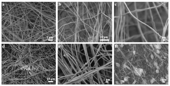SEM images of carbon nanofiber (a), PAN/ZnO nanofiber-4% (b,c), PAN/ZnO nanofiber-7% (d,e), and PAN/ZnO nanofiber-10% (f).
