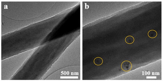 (a,b) TEM images of the PAN/ZnO-7% nanofiber (the yellow circle is a nanoparticle).