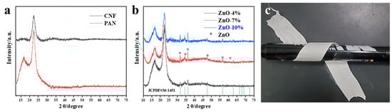 Figure 5a shows the XRD of a carbon nanofiber and PAN nanofiber. From Figure 5a, it can be seen that there are two broad peaks of 16.3° and 22.3° for PAN; after heat treatment of the PAN nanofiber, the carbon nanofiber applied in this article was obtained. As shown in Figure 5a, the carbon fibers disappeared with a broad wind of 16.3° and only had a broad peak of 22.6°, indicating complete carbonization and obtaining the complete carbon nanofiber. Figure 5b shows the XRD patterns of the 4%, 7%, and 10% PAN/ZnO nanofibers. It can be seen from the images that there are two broad peaks of about 16.6° and 22.5° in the 4%, 7%, and 10% PAN/ZnO nanofibers, which are characteristic peaks of PAN and ZnO nanoparticles, as at 2θ, sharp characteristic diffraction peaks appear at 31.8°, 34.4°, 36.2°, 47.5°, 56.6°, 62.8°, 66.3°, 67.9°, and 69°, respectively. From Figure 5b, it can be seen that, for the PAN/ZnO nanofiber with doping concentrations of 4%, 7%, and 10%, the higher the doping concentration of the ZnO nanoparticles in the XRD pattern, the stronger the diffraction peak of ZnO. The XRD pattern in Figure 5b shows the diffraction peak structure of PAN and ZnO. Figure 5c shows a physical image of the PAN/ZnO nanofiber, which has excellent flexibility.