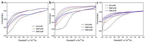 Figure 6a,b show the cyclic voltammetry curves of the 4%, 7%, and 10% PAN/ZnO nanofibers as separator sodium-ion batteries. According to the CV curves in CNF and lithium metal half-cells, the operating voltage window of the half-cell is 0–2 V. From the figure, it can be seen that the cyclic voltammetry peaks of 4%, 7%, and 10% PAN/ZnO nanofibers as separators for sodium-ion batteries are similar, and the cyclic voltammetry curves of PAN/ZnO nanofiber-4% and PAN/ZnO nanofiber-7%, and PAN/ZnO nanofiber as the separator for sodium-ion batteries, have good repeatability for two to three cycles and excellent cycling performance.