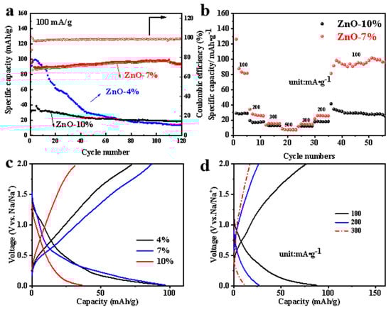 Figure 7b shows the rate plots of the 7% and 10% PAN/ZnO nanofibers used as separator sodium-ion batteries. At current densities of 0.1, 0.2, 0.3, and 0.5 A/g, the discharge-specific capacities of the PAN/ZnO-7% nanofiber used as a separator for sodium-ion batteries are 125.4, 32.3, 15.4, and 6.3 mAh/g, respectively. When the current density recovers to 0.1 C, it can be maintained at the reversible discharge-specific capacity of 92.1 mAh/g. Compared to PAN/ZnO-10% nanofiber membrane sodium-ion batteries, PAN/ZnO-7% nanofiber membrane sodium-ion batteries have a better specific capacity at different current densities. Figure 7c shows the first cycle charge discharge curves of the 4%, 7%, and 10% PAN/ZnO nanofiber membrane sodium-ion batteries. The PAN/ZnO-7% nanofiber membrane for sodium-ion batteries has a higher specific capacity and Coulombic efficiency. Figure 7d shows the charge–discharge curves of a PAN/ZnO-7% nanofiber membrane sodium-ion battery at different current densities. It can be seen from the figure that the specific capacity changes significantly when the current density increases to 0.2 A/g. However, as the current density increases, the trend of the specific capacity changes gradually decreases and tends to stabilize after reaching 0.3 A/g.