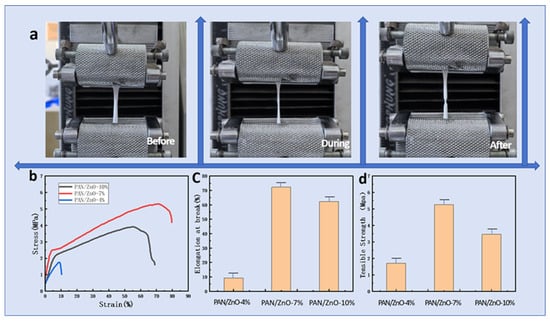 Mechanical properties of PAN/ZnO. (a) The optical photos of the stress–strain behavior of PAN/ZnO-10%. (b) Stress–strain curves of PAN/ZnO. (c) Extension at the peaks of three different PAN/ZnO. (d) Tensile strengths of three different PAN/ZnO.