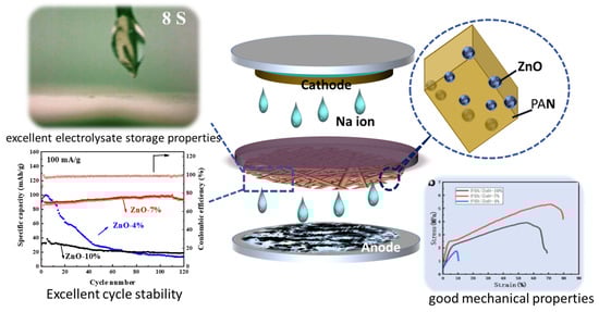 Figure 8 shows the infiltration angle of the PAN/ZnO-7% nanofiber in an electrolyte, which is lost instantaneously after dropping. The PAN/ZnO-7% nanofiber has excellent electrolysate storage properties, which may be due to the structure of the nanofiber membrane, which increases the infiltration of the electrolysate. In general, the lower contact angle helps to promote the transmission of the ionizer, thereby improving the cycle performance for sodium-ion batteries.