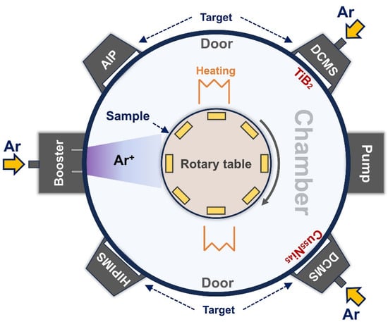 The equipment used in this study was an industrial MC-800 film deposition machine (Huasheng Co., Ltd., Dongguan, China). A schematic of the film equipment is shown in Figure 1. The dimension of the vacuum chamber was 850 × 650 mm2 and it had two DC magnetron-sputtering (DCMS) sources, a high-power impulse magnetron sputtering (HiPIMS) source, two pulsed arc sources, and two ion sources. The device can be installed simultaneously with four different targets, which are attached to a copper back plate in front of the cathode; the target size required for magnetron sputtering was 500 × 100 × 10 mm3. The CuNi and TiB2 layers prepared in this study were supplied with DC magnetron power.