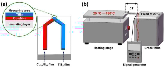 This study aimed to develop a new type of thin-film thermocouple based on metal/boride films. To facilitate the measurements, Al2O3 substrates were used as the thin-film thermocouple insulation substrate. This investigation focuses on temperature measurements, sensitivity, and linearity of the thin-film thermocouple. Figure 2a shows the schematic of the sensor film structure. The length and width of the sensor film were ~50 and 2 mm, respectively. Figure 2b presents a schematic of the measuring device used to determine the potential difference of the thermocouple. The hot junction of the sensor film was mounted on a heating plate. The other sides of the sample were put on the support platform at the same height as the heating platform. Two K-type thermocouples (electrically insulated) were placed at the hot and cold ends. The hot-end temperature was increased from 20 to 180 °C, while cold-end temperature was kept at 20 °C. During the heating, a signal generator was connected to detect the variation of the thermoelectric potential. The signal generator has an accuracy of ±0.1% and a minimum resolution of 10 μV.