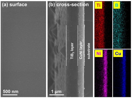 The microstructures of the hot-junction part of the CuNi/TiB2 thin-film thermocouple prepared by DC magnetron sputtering are shown in Figure 3. The surface of the TiB2 layer was smooth and dense (Figure 3a). The cross-sectional image (Figure 3b) of the film clearly shows that both the CuNi and the TiB2 layers grow continuously along their cross-sections without voids. The thickness values of the CuNi and the TiB2 layers were ~400 and 800 nm, respectively. The TiB2 outer layer exhibits a fine columnar crystal structure. The inner CuNi layer exhibited a clear interface with the TiB2 and coarse grains under a deposition temperature of 400 °C. The EDS mapping results acquired from Figure 3b confirm the formation of the CuNi inner and the TiB2 outer layers.