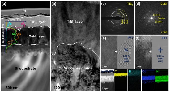 In this study, the phase structures of the films were studied using grazing incidence X-ray diffraction (GIXRD, D8 Advanced, Bruker, Billerica, MA, USA). The scanning range, incident angle, and step size were 30°–80°, 1°, and 0.02°, respectively. A field emission scanning electron microscopy (FE-SEM, SU8220, Hitachi, Tokyo, Japan) was used to analyze the microstructure, morphologies, and thickness of the film samples. Energy-dispersive X-ray spectrometry (EDS) was used to measure the elemental distribution and concentrations of the films. The transmission electron microscope (TEM, Talos F200i, Thermo Scientific, Waltham, MA, USA) was further employed to characterize the CuNi/TiB2 interface structure and element distribution of the films. The focused ion beam system (FIB, Quanta 3D 200i, FEI, Hillsboro, OR, USA) was used to prepare a cross-sectional TEM sample of the film.
