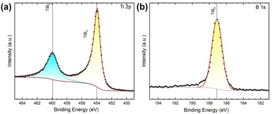 The Ti 2p and B 1s XPS spectra obtained from the TiB2 layer are shown in Figure 6. The Ti 2p spectrum (Figure 6a) consisted of a spin orbit–split doublet 2p3/2–2p1/2, with peaks at 454.2 and 460.1 eV, respectively. The peak positions corresponded to the Ti-B bond [,]. The B 1s spectrum shown in Figure 6b exhibits one peak at 187.1 eV corresponding to Ti-B bonds, with no evidence of elemental B, B-Cr or BOx.