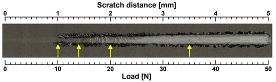 The hardness and elastic modulus of the CuNi/TiB2 hot joint were determined from the displacement–load curve after pressing the indenter into the sample using a nanoindentation instrument. According to the SEM result, the TiB2 sensing layer was thicker and the thickness of the entire hot junction was approximately 1.2 μm. Therefore, the maximum load used in this study was set to be 5 mN. The hardness and the elastic modulus of the TiB2 layer are 20.5 GPa and 315.9 GPa, respectively. Figure 7 shows the optical image of the scratch track of the CuNi/TiB2 hot joint on a cemented carbide substrate. The maximum load was set to be 50 N. Cracking of the TiB2 layer occurs under a load of ~10 N. The delamination of the TiB2 layer on CuNi buffer layer can be noticed under a load of ~14 N. The CuNi layer was completely exposed to the tip as the load was increased to ~20 N. A further increase in the load up to ~35 N produces the finally substrate exposure.