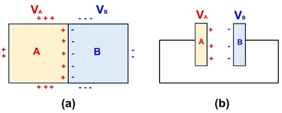 Schematic diagram of the contact potential difference. (a) The contact potential difference was produced at the interface when two kinds of materials were in direct contact. (b) The contact potential difference was produced at the surface when two kinds of materials were connected by wires.