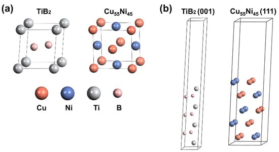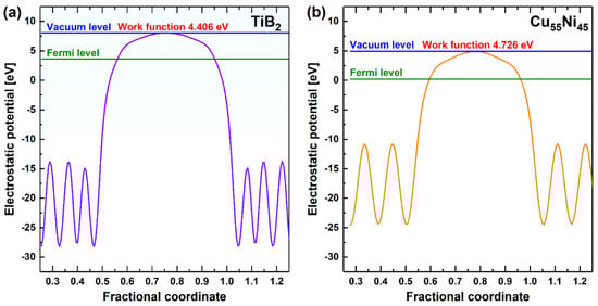 Computations were performed using the first-principles calculations, implemented using the Cambridge Serial Total Energy Package (CASTEP) module []. The generalized gradient approximation (GGA) [] with the Perdew–Burke–Ernzerhof (PBE) functional [] was used for determining the exchange–correlation potential in combination with the dispersion-corrected density functional theory (DFT-D) method. Spin polarization calculations were performed using GGA. The Broyden–Fletcher–Goldfarb–Shanno (BFGS) method was used to determine the ground state of the supercells. The convergence tolerance of the geometry-optimized atomic step was set to a maximum displacement change of less than 0.001 Å and a stress of less than 0.05 GPa; the maximum energy change was set to below 10−5 eV per atom and the force was less than 0.02 eV Å−1. The cutoff energy of the atomic wave functions was set to 500 eV. The cut-off energy of the atomic wave functions was set to 500 eV. The calculated results of the final work functions of the two layers are shown in Figure 11. The work functions of the TiB2 and the CuNi were 4.406 eV and 4.726 eV, respectively. Thus, the difference in work functions between the two layers was more than 0.3 eV, which is consistent with the experimental results.