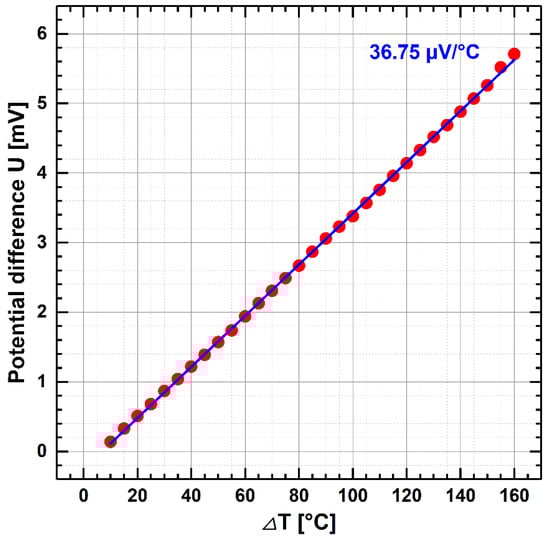 Calibration curve of ∆T vs. potential difference of the CuNi/TiB2 film sensor after oxidation at 400 °C for 10 h.