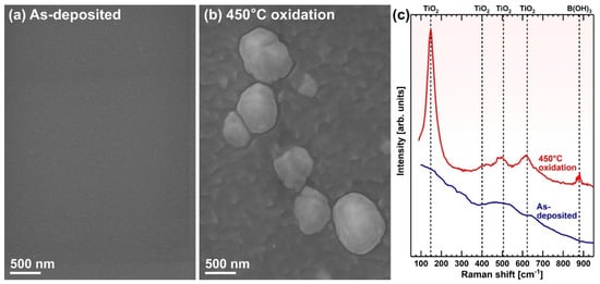 SEM surface images of the (a) as-deposited and (b) 450 °C oxidized CuNi/TiB2 hot joint. (c) Present Raman spectra of the as-deposited and oxidized CuNi/TiB2 hot joint. The spectra were acquired on the film surface at room temperature.