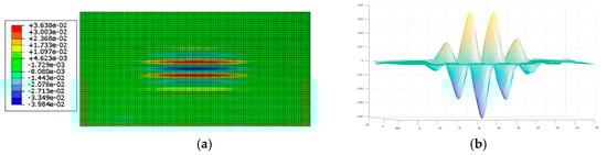 Under the condition that the tension is 1 N, the elastic modulus is 2100 MPa, and Poisson’s ratio is 0.3, the numerical simulation model of a web wrinkle with different thickness is established by changing the web thickness, and the stress cloud of critical compressive stress is obtained. Figure 10 shows the influence of different web thicknesses on the web wrinkle deformation on the surface of the guide roller in four situations: (1) the web thickness is 0.01 mm (as shown in Figure 10a); (2) the web thickness is 0.02 mm (as shown in Figure 10b); (3) the web thickness is 0.05 mm (as shown in Figure 10c); (4) the web thickness is 0.1 mm (as shown in Figure 10d).