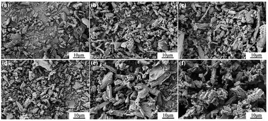 The SEM images of (a) B1, (b) B2, (c) B3, (d) B4, (e) B5, and (f) B6.