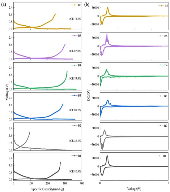 (a) First charge–discharge curves of hard carbon B1, B2, B3, B4, B5, B6, at 30 mA·g−1; (b) Charge–voltage variation (DQ/DV) curves of hard carbon B1, B2, B3, B4, B5, B6.