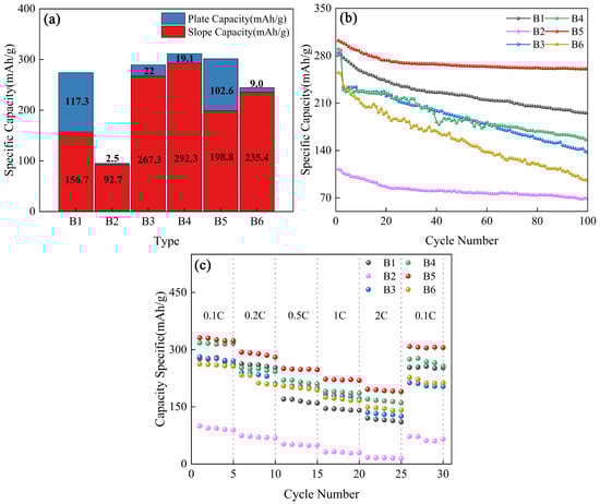Figure 5 presents the analyzed capacity curves for the six samples, data plots for 100 cycles at a current density of 60 mA·g−1, and rate performance plots at various current densities. As depicted in Figure 5a, the specific capacities of the six samples were 274 mAh·g−1, 95.2 mAh·g−1, 289.3 mAh·g−1, 311.4 mAh·g−1, 301.4 mAh·g−1, and 244.4 mAh·g−1, respectively. The significant decrease in B2 capacity is attributed to two reasons. Firstly, the incomplete oxidation reaction and the scarcity of oxygen-containing groups led to the hard carbon’s poor surface activity, which restricted the intercalation of sodium-ions and resulted in a capacity decrease. Secondly, although oxidation can modify the microstructure of the hard carbon, the pores were not optimized for the efficient storage of sodium-ions due to the short oxidation time [37,38]. The slope capacity of the pre-oxidized hard carbon material increases significantly while the platform capacity decreases. This is primarily because of the strong oxidation of H2O2, which generates a large number of edge defects. During the charging and discharging process, sodium-ions are preferentially adsorbed by these sites, contributing to the increase in slope capacity [39,40]. B5’s plateau capacity is considerably higher than B3, B4, and B6. On the one hand, the appropriate pre-oxidation time inhibits the overgrowth of graphite microcrystals, and a large number of closed pores are formed, providing sufficient space for the insertion and storage of sodium-ions and thereby enhancing the plateau capacity [41]. On the other hand, a reasonable oxidation time can effectively regulate the pore structure, facilitating the sodium-ions to enter the interior of the material and further improving the plateau capacity [42,43].