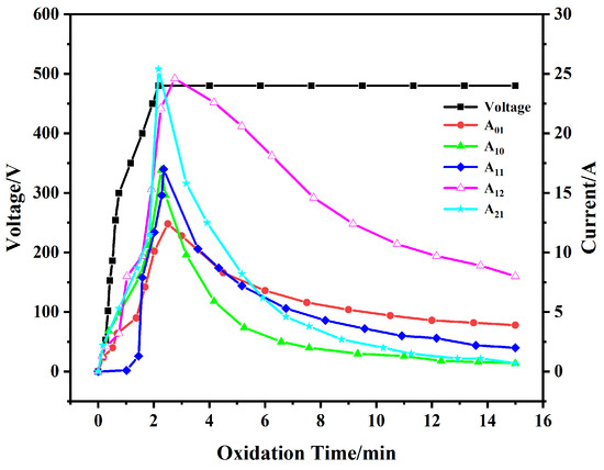 Figure 1 delineates the relationship between voltage, current, and oxidation time for 6061 aluminum alloy under varying electrolyte ratios. The data reveal that, under constant voltage mode, the current for each specimen increases and subsequently decreases as oxidation time elapses. This behavior is attributed to the sharp voltage increase during the anodic oxidation stage, where the growing blocking effect of the passivation coating on the current—continuously generated on the aluminum substrate surface—results in a peak between 120 and 140 s before stabilization. The stabilization is further influenced by factors such as electrolyte composition and concentration, voltage settings, electrolyte temperature, the distance between the workpiece and the electrode, and the sealing conditions of the electrolytic tank. Notably, the peak currents for the A12 and A21 schemes are higher and comparably close, with the A21 scheme experiencing a more pronounced decline post-peak, whereas the A12 scheme exhibited a milder decrease. In contrast, the A10 scheme exhibited the lowest peak current with minimal fluctuation, a trend related to the electrolyte’s conductivity.