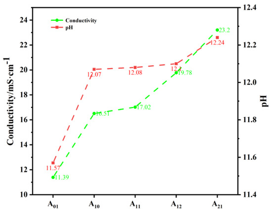 Figure 2 illustrates the changes in electrolyte conductivity and pH across different experimental schemes. The analysis indicates that, in schemes A01, A11, and A21, where KF concentration remains constant, both electrolyte conductivity and pH values rise with increasing NaOH concentration due to the fact that NaOH can ionize Na+ and OH− completely in the water. Conversely, in schemes A10, A11, and A12, where NaOH concentration is held fixed, KF concentration increases did not markedly influence the electrolyte’s pH, yet conductivity rose with higher KF levels, which was attributed to the fact that KF could ionize K+ and F−, but the hydrolysis of F− in water was weak, so the effect on pH was not significant. This suggests that both NaOH and KF concentrations play a role in modulating electrolyte conductivity and pH, with NaOH’s influence being more pronounced.