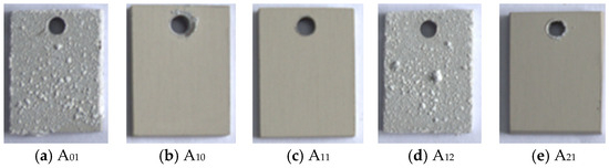 Figure 3 presents the macroscopic morphology of the 6061 aluminum alloy surface post-micro-arc oxidation treatment across various process schemes. The findings indicate that, under schemes A10, A11, and A21, the aluminum alloy surfaces were successfully coated with complete, uniform, continuous, and smooth micro-arc oxidation coatings. Conversely, the surfaces under schemes A01 and A12 exhibited noticeable white bumps and a rough texture, significantly degrading the surface quality, which could be attributed to the insufficient OH− and the unstable formation of passivation film leading to the decrease of densification and increase of porosity, which, in turn, affected the quality and appearance of the film layer.