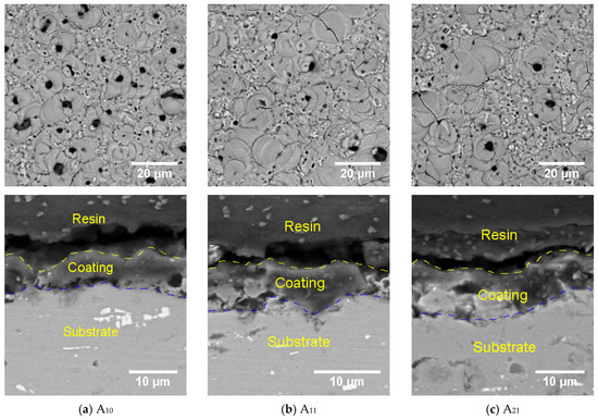 Figure 4 depicts the surface and cross-sectional micro-morphology of specimens A10, A11, and A21 following micro-arc oxidation treatment. All samples exhibit a characteristic “crater” morphology, a result of the micro-arc oxidation process where the arc repeatedly penetrates the oxide coatings, leading to gas discharge and the formation of microporous structures. The molten oxide is then ejected through these micropores, coming into contact with the electrolyte solution and rapidly solidifying, which contributes to the coating’s accumulation and rough texture.