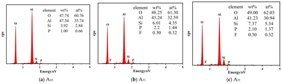 Figure 6 presents the results of energy dispersive spectroscopy (EDS) for the surface elements of the A10, A11, and A21 coatings. The analysis reveals that the A10 coating is primarily composed of Al, Si, O, P, and other elements. In contrast, after the addition of KF in the A11 and A21 schemes, the coatings contain Al, Si, O, F, and P elements. The Al element is derived from the aluminum alloy matrix, while O, F, and P are introduced from the electrolyte. Si is primarily sourced from the electrolyte, with a minor contribution from the matrix.