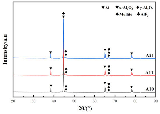 To delve deeper into the physical phase constitution of the coatings, XRD analysis was conducted. Figure 8 illustrates the XRD spectra for the A10, A11, and A21 coatings. The spectral data reveal that these layers are predominantly composed of Al, α-Al2O3, γ-Al2O3, mullite, AlF3, and additional phases. The Al phase is derived from the coating matrix. The emergence of the other phases is likely attributed to ionic interactions occurring within the electrolyte. Hypothetical formation reactions for these phases might include the following: