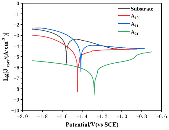 Figure 9 presents the kinetic potential polarization curves for the substrate and the coatings of various schemes, with the fitting results detailed in Table 3. The analysis reveals that the corrosion current density (Jcorr) follows the order A21 > A10 > A11, from smallest to largest. The corrosion potential of the micro-arc oxidation-treated specimens shifted positively compared to the substrate, suggesting a reduced corrosion tendency for each coating.