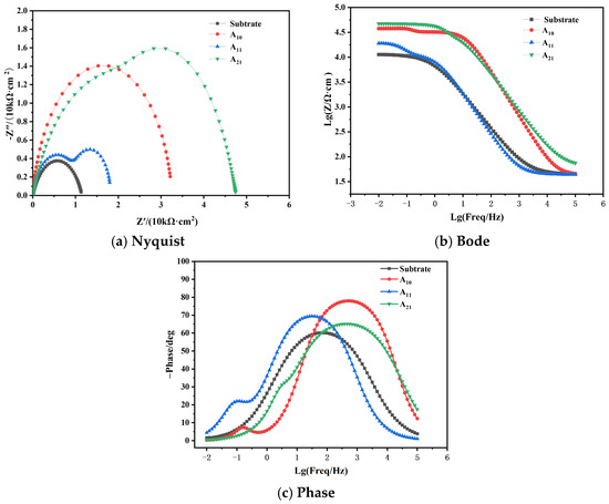 The Nyquist plots in Figure 10 show that the impedance modulus and the capacitive arc radius for the coatings of schemes A10, A11, and A21 are greater than those of the substrate. This suggests that the micro-arc oxidized specimens offer improved resistance to the penetration of the NaCl corrosive medium compared to the substrate, thereby significantly enhancing the corrosion resistance in neutral NaCl solution.