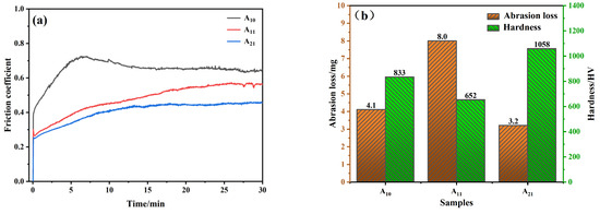 Figure 12 presents the friction coefficient, abrasion loss, and hardness of the coatings under different schemes. Figure 12a indicates that the friction coefficient of the coatings follows the order A21 > A11 > A10, from highest to lowest. Figure 12b shows that the abrasion loss of the coatings is A11 > A10 > A21, while the hardness of the coatings is A21 > A11 > A10, both in descending order.