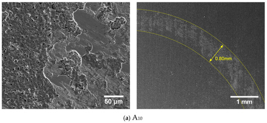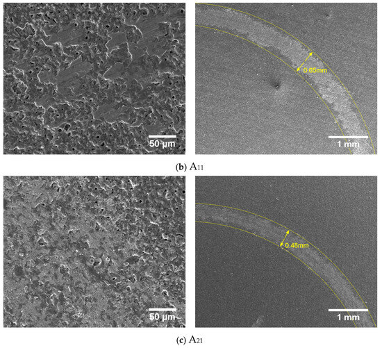 The electrolyte’s NaOH/KF ratio was found to profoundly influence the coating’s apparent quality. Notably, when the KF concentration surpassed that of NaOH, the formation of a high-quality coating on the sample surface was challenging. Given these observations, further performance characterization was focused solely on the specimens treated with the A10, A11, and A21 schemes, as they demonstrated the most promising coating quality.